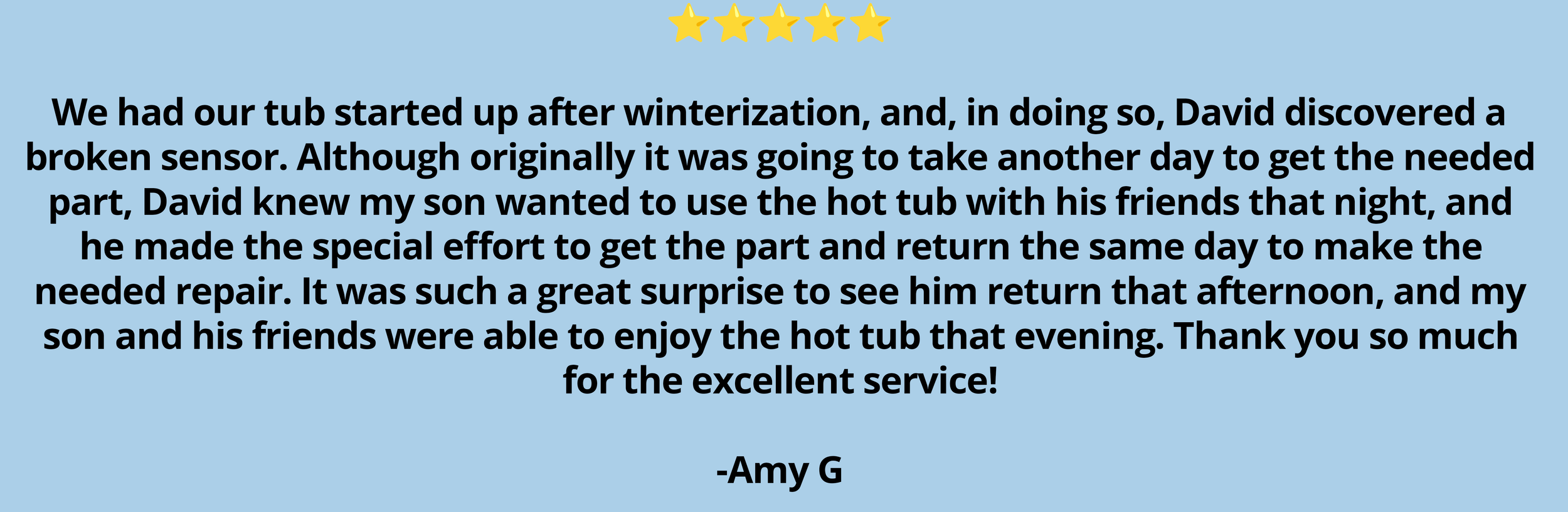 We understand that a non-operational spa can quickly impact your home or rental property. That’s why we offer responsive scheduling with next-day service available Monday - Friday. Our goal is to minimize downtime, prevent further damage, and ensure your spa is operating safely and efficiently year-round.